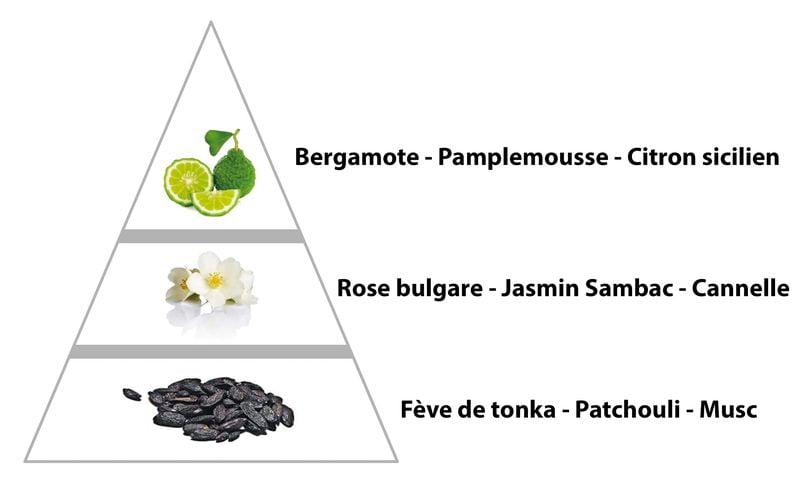 Dans les notes de tête se détachent des essences d’agrumes et exotiques, dans les notes de cœur le mélange de rose bulgare, de jasmin sambac, de praliné et de cannelle et dans les notes de fond, des touches de bois de santal, de cèdre, de patchouli et de musc.
