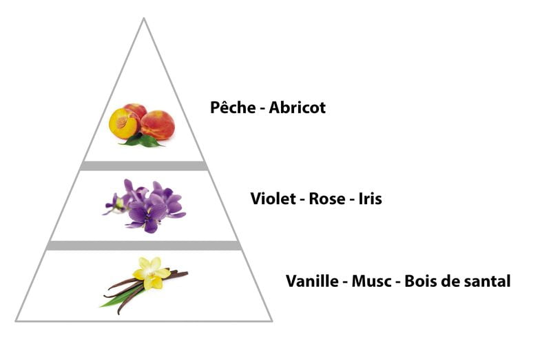 Cœur fondamentalement rose et fond d’iris, d’héliotrope et de violette soutenu par le bois de santal et le musc avec un sillage identifiable d’une grande présence.