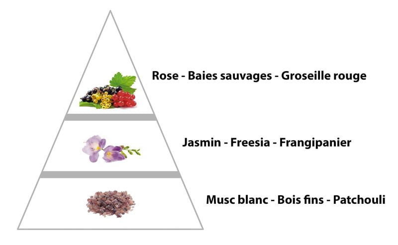 Le cœur floral est composé de jasmin, de freesia et de frangipanier et son fond est une combinaison de muscs blancs, de bois fins et de patchouli blanc.