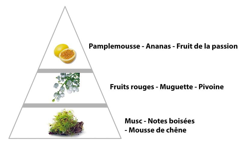 Les notes de fond mêlent musc, notes boisées et mousse de chêne.